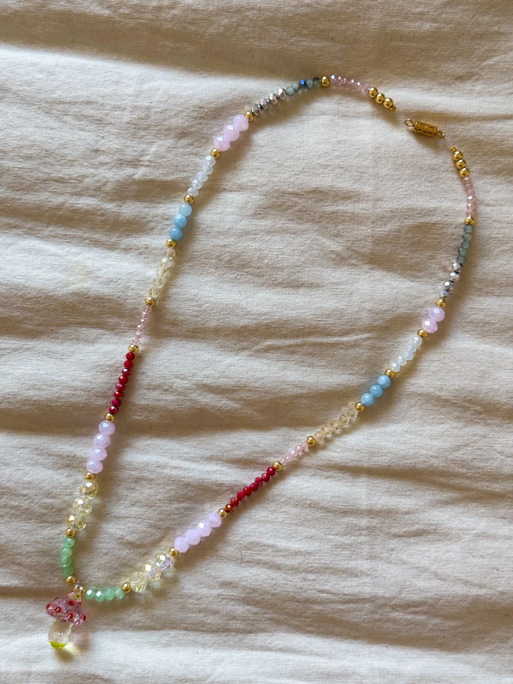 Collar de cuentas de vidrio, cristales checos, canutillones de vidrio, cuentas miyuki y piezas bañadas en oro.